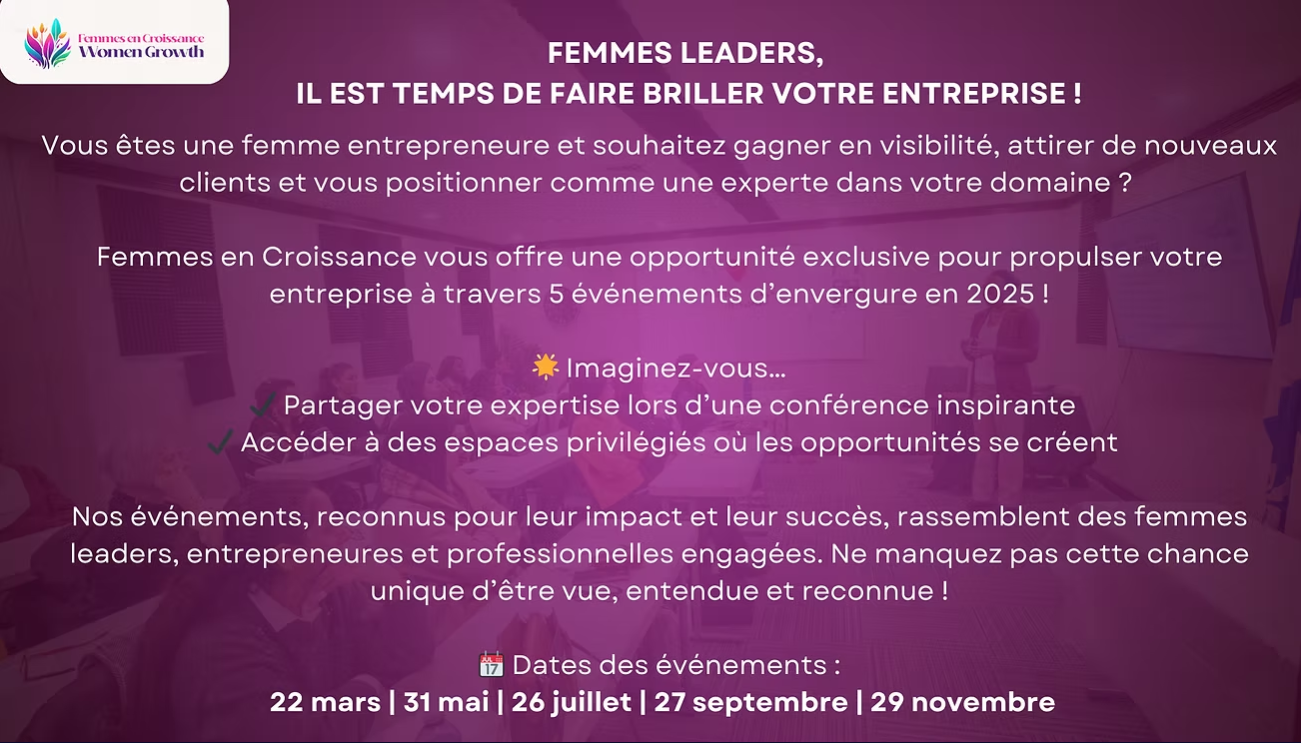 FEMMES LEADERS, IL EST TEMPS DE FAIRE BRILLER VOTRE ENTREPRISE ! Vous êtes une femme entrepreneure et souhaitez gagner en visibilité, attirer de nouveaux clients et vous positionner comme une experte dans votre domaine ? Femmes en Croissance vous offre une opportunité exclusive pour propulser votre entreprise à travers 5 événements d’envergure en 2025 ! […]