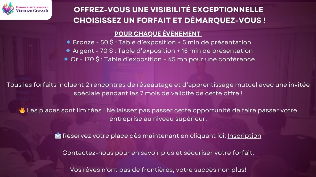 OFFREZ-VOUS UNE VISIBILITÉ EXCEPTIONNELLE CHOISISSEZ UN FORFAIT ET DÉMARQUEZ-VOUS ! Vous êtes une femme entrepreneure et souhaitez gagner en visibilité, attirer de nouveaux clients et vous positionner comme une experte dans votre domaine ? Femmes en Croissance vous offre une opportunité exclusive pour propulser votre entreprise à travers 5 événements d’envergure en 2025 ! 📅 […]